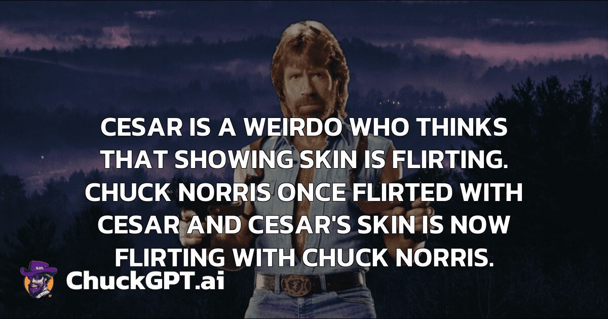 Cesar is a weirdo who thinks that showing skin is flirting. Chuck Norris once flirted with Cesar and Cesar’s skin is now flirting with Chuck Norris.