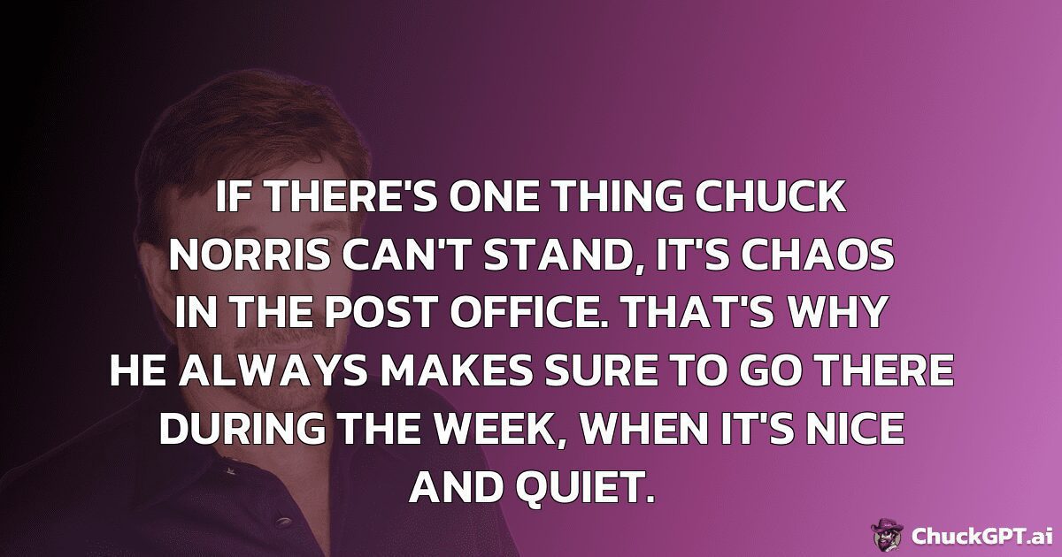 If there’s one thing Chuck Norris can’t stand, it’s chaos in the post office. That’s why he always makes sure to go there during the week, when it’s nice and quiet.