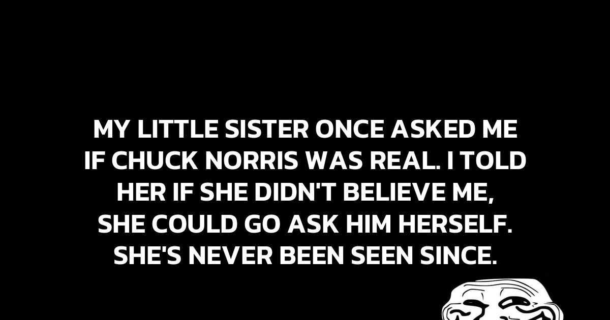 My little sister once asked me if Chuck Norris was real. I told her if she didn’t believe me, she could go ask him herself. She’s never been seen since.