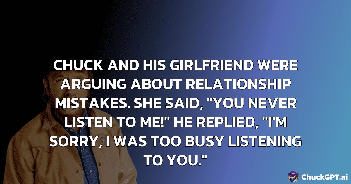 Chuck and his girlfriend were arguing about relationship mistakes. She said, “You never listen to me!” He replied, “I’m sorry, I was too busy listening to you.”